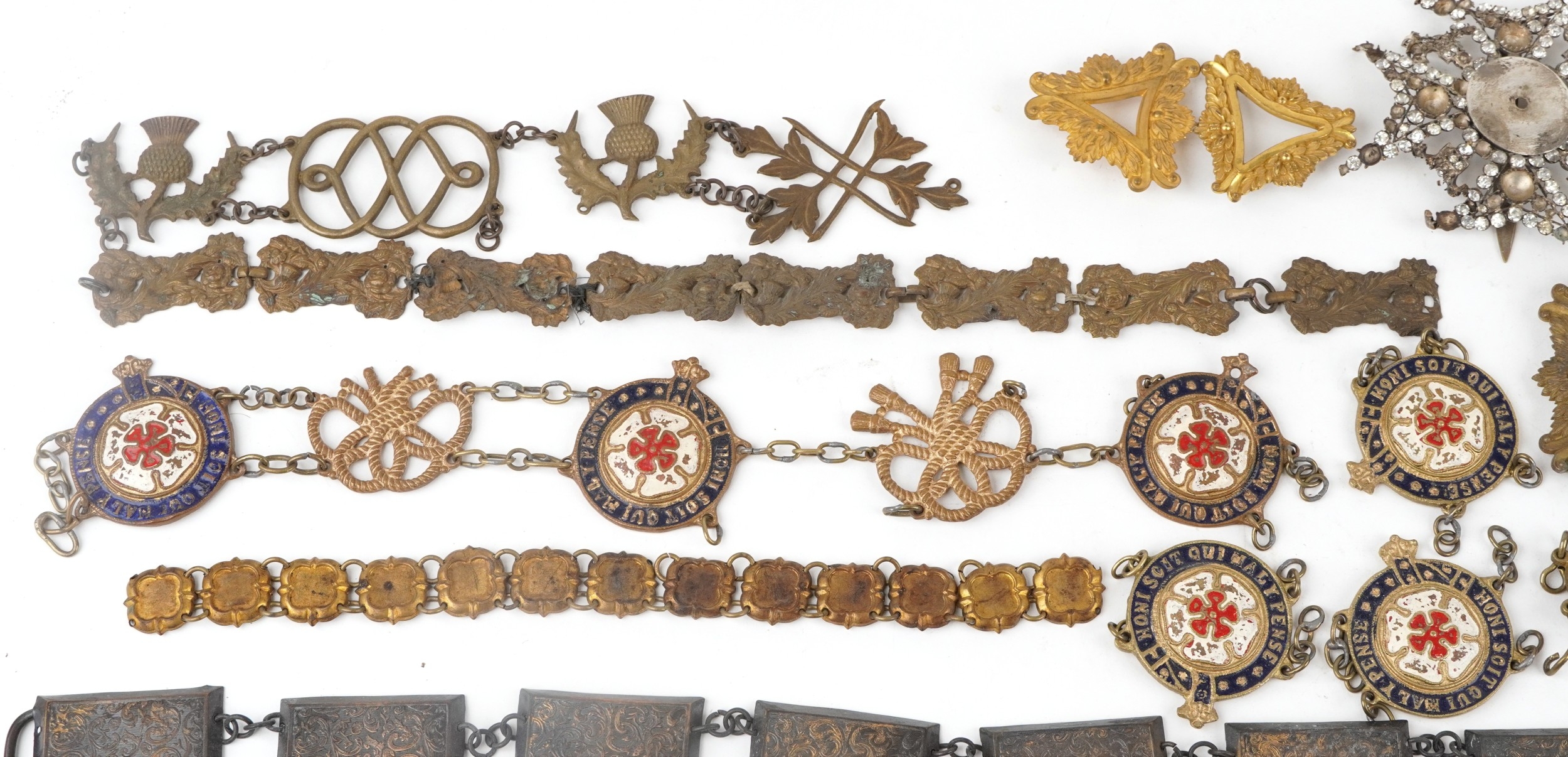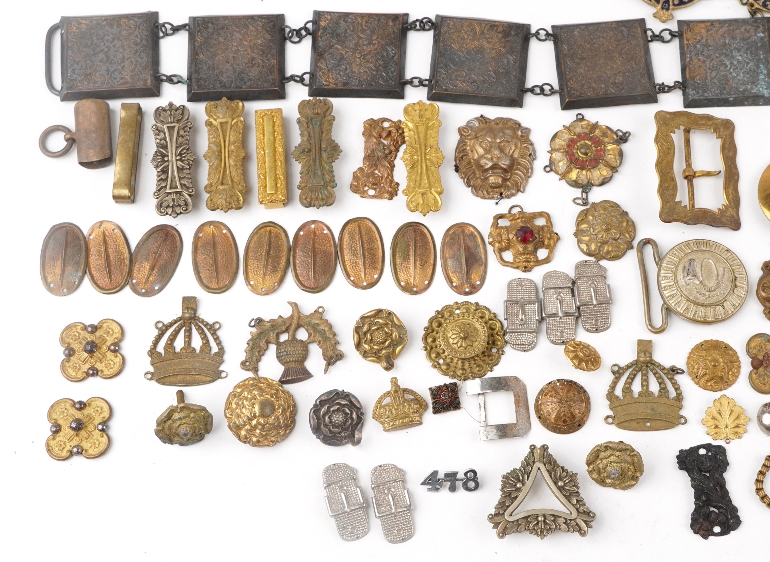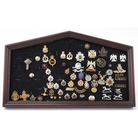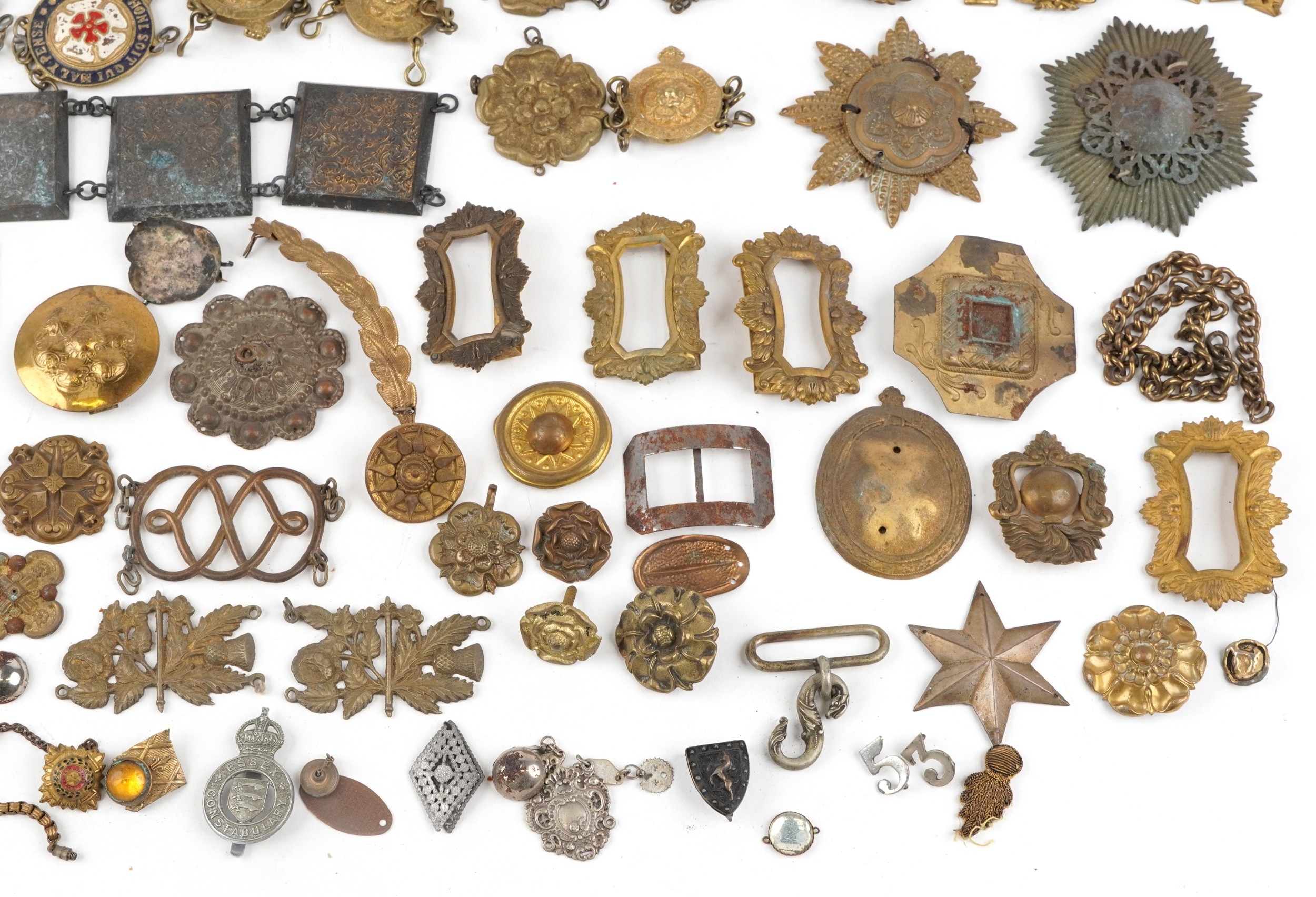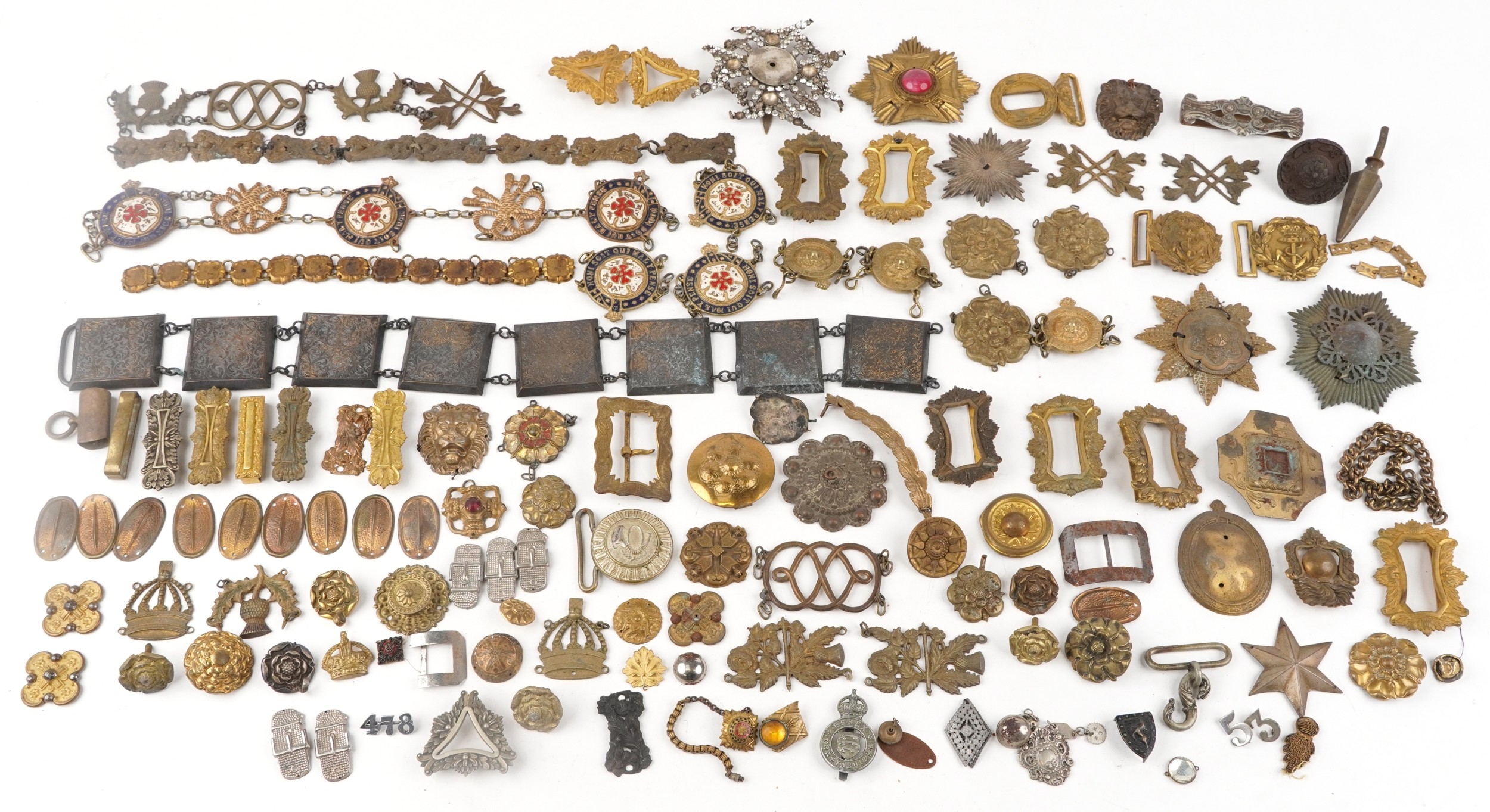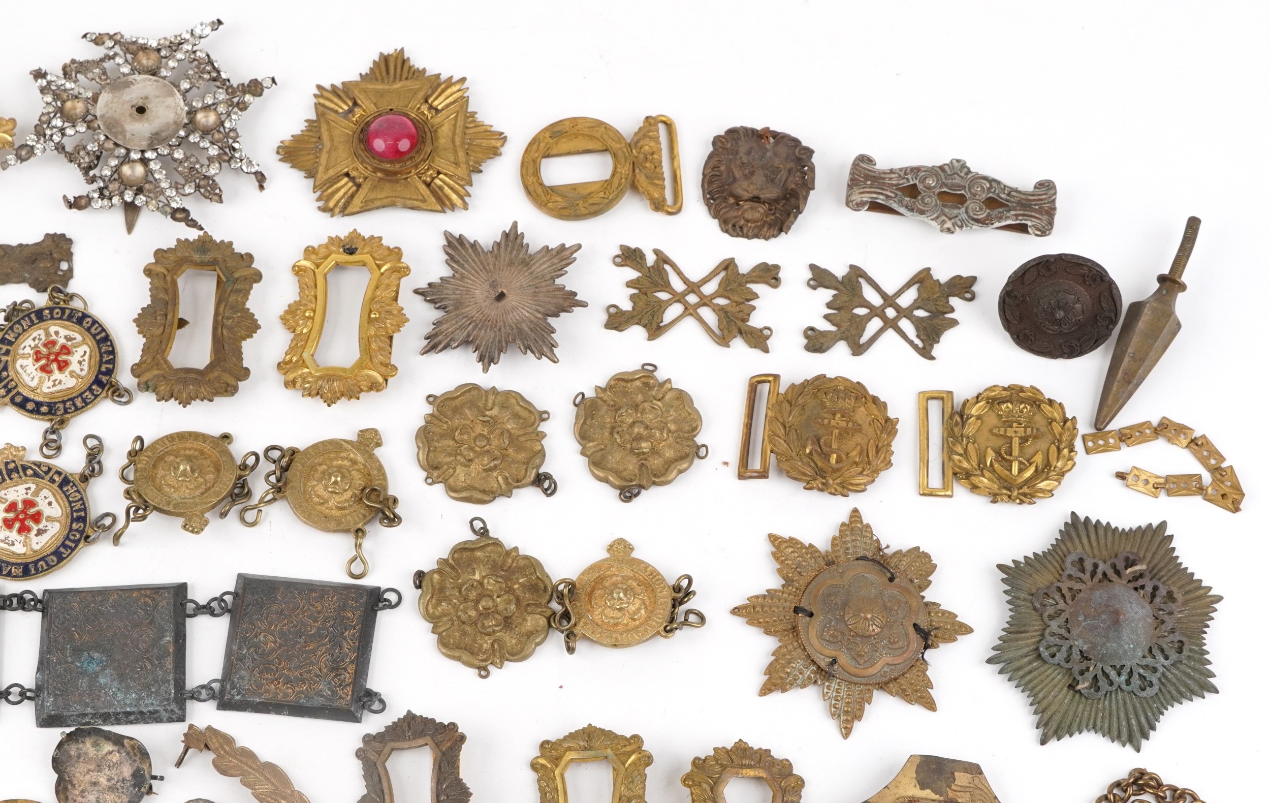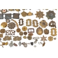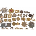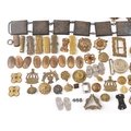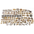 A large collection of military interest badges and belt buck...