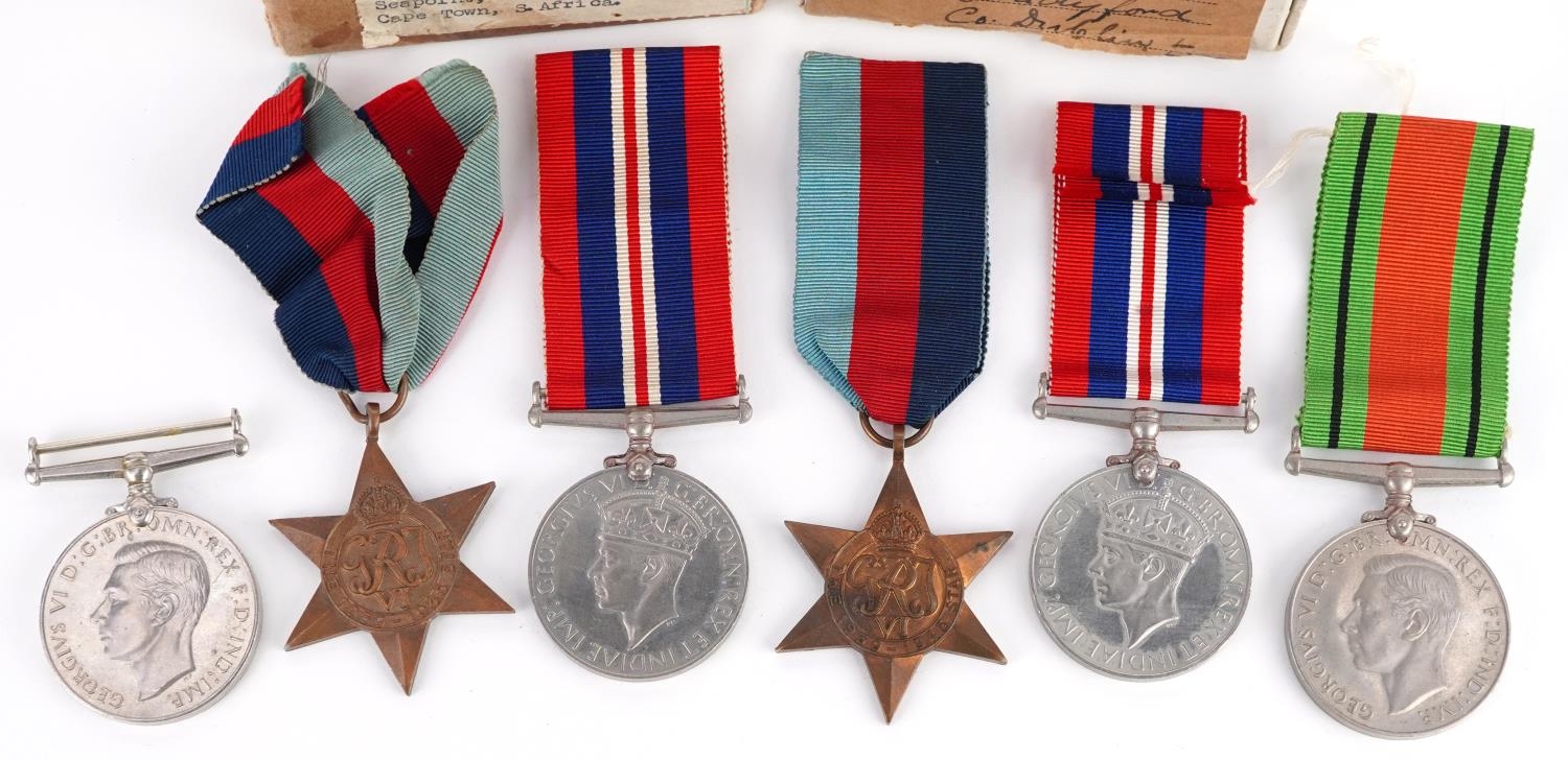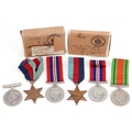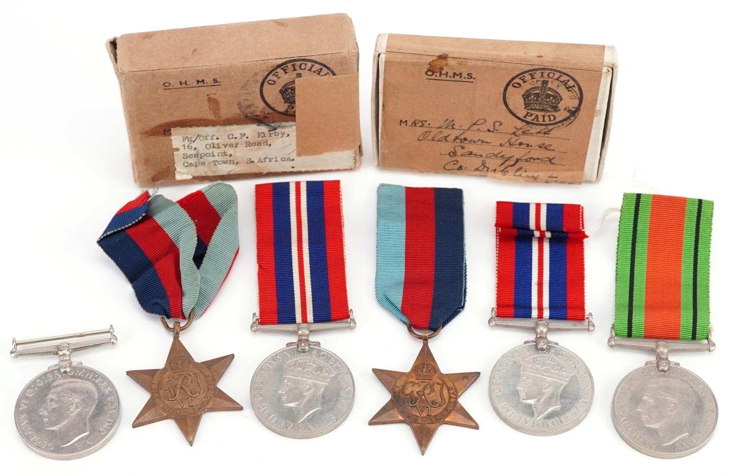 Two British military World War II medal trios with two boxes of issue addressed to C F Kirby and P S Lett?.