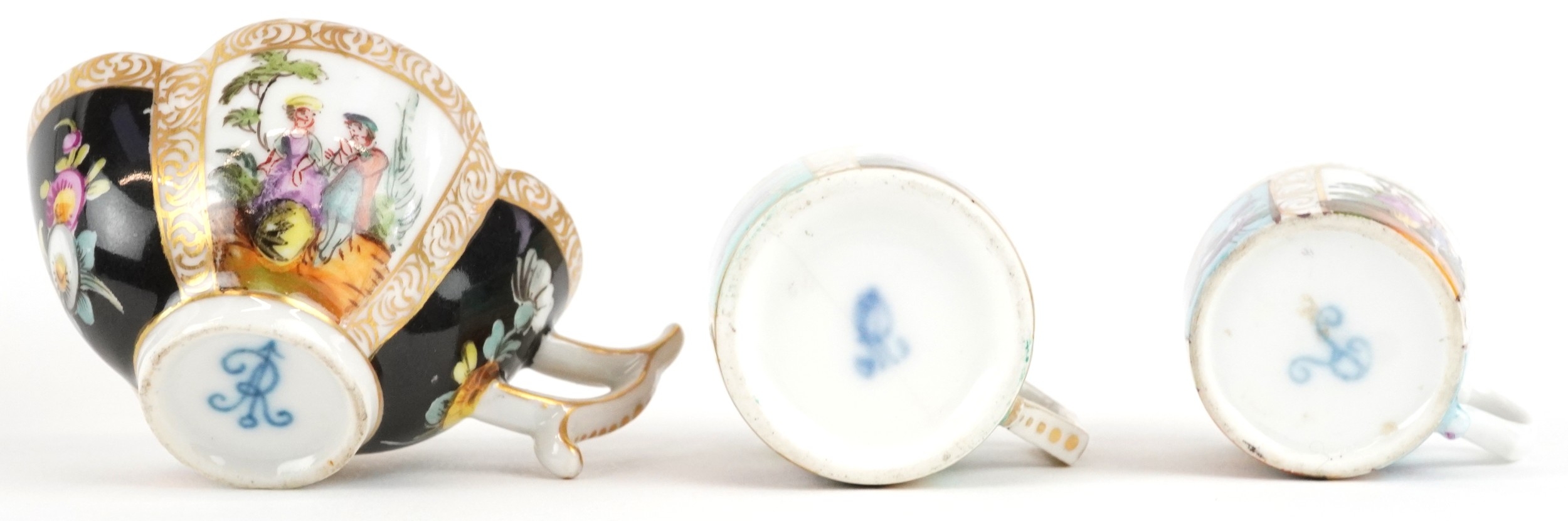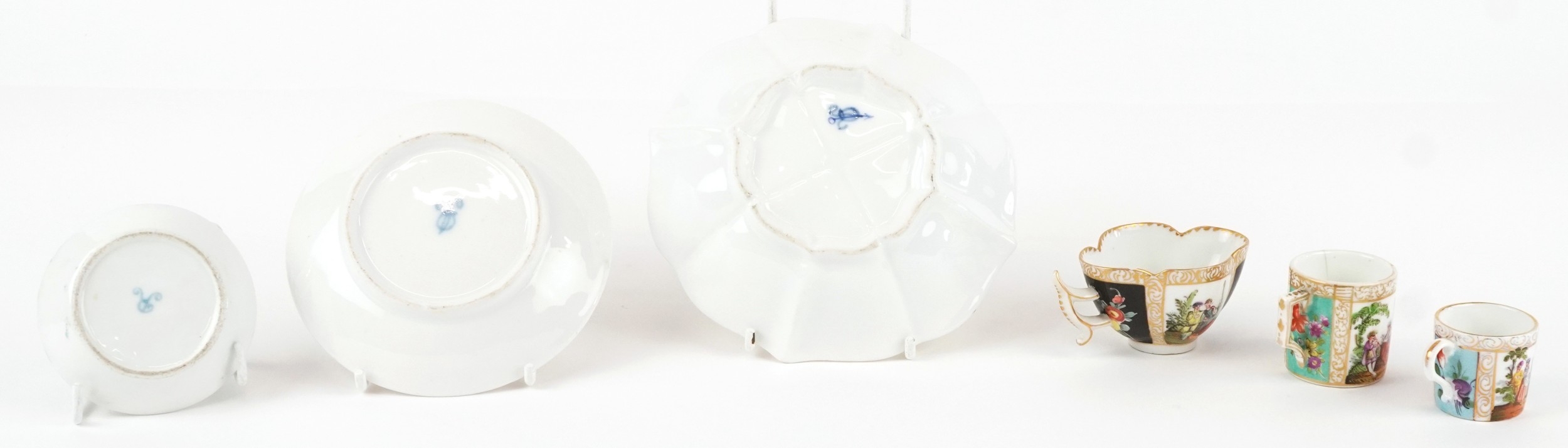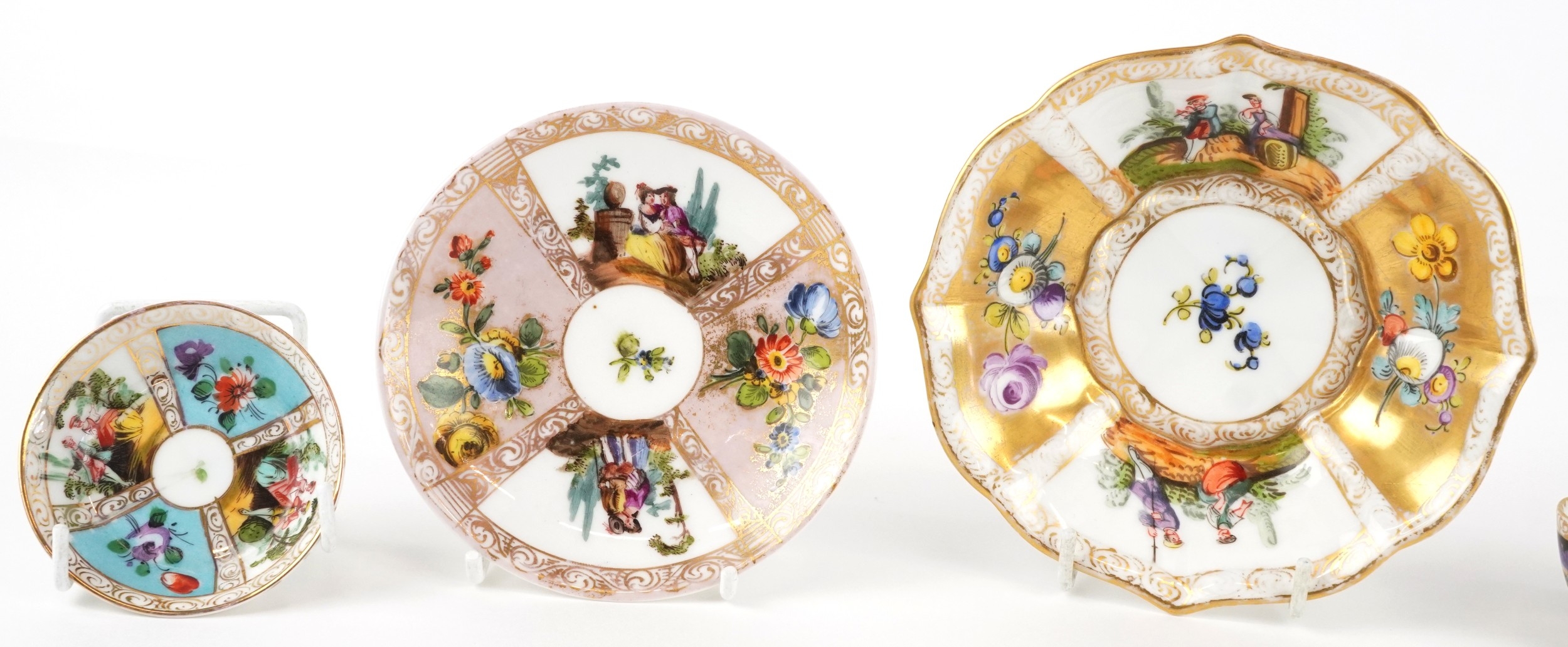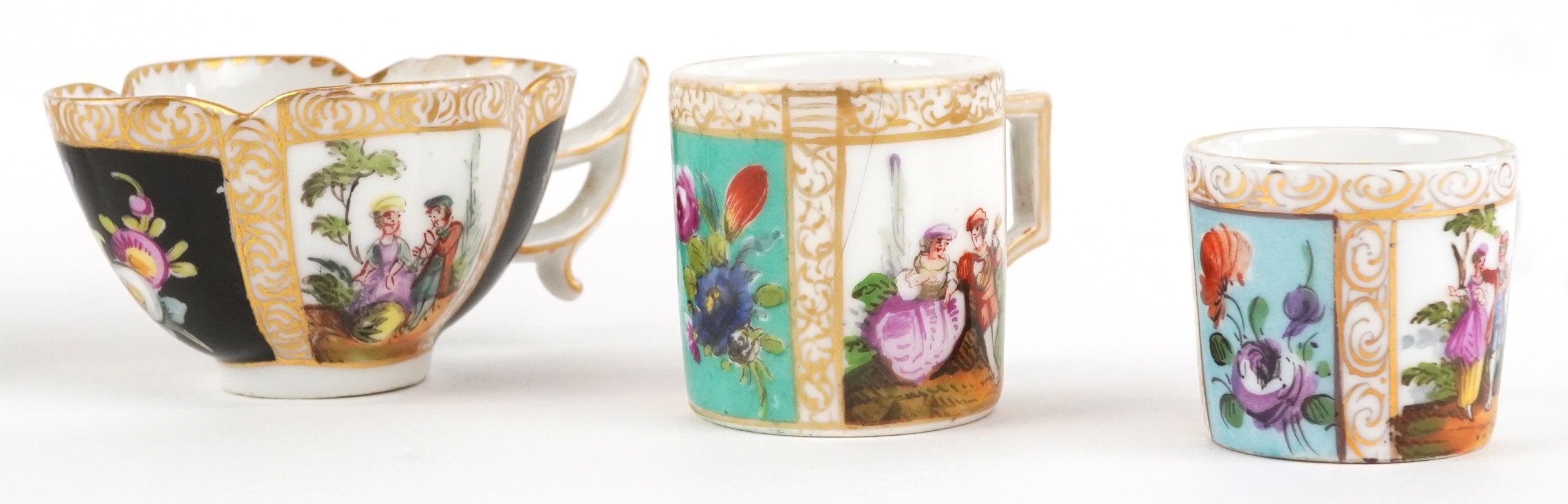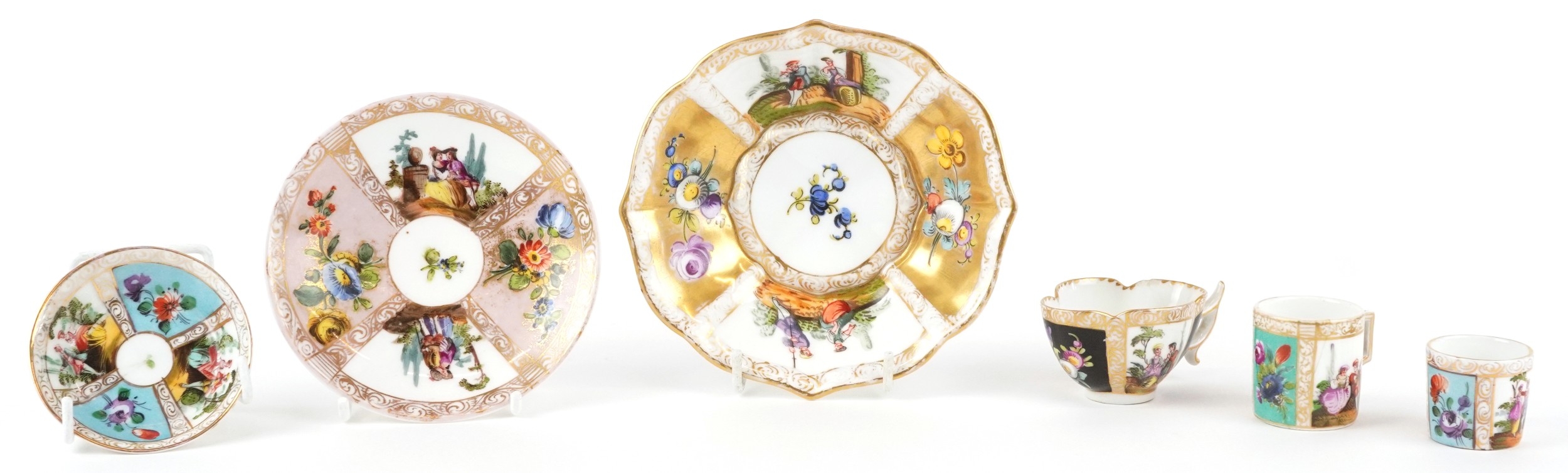 19th century Meissen style porcelain including diminutive coffee cups and saucers, each hand painted with panels of figures and interspersed floral decoration, the largest 13cm in diameter.