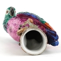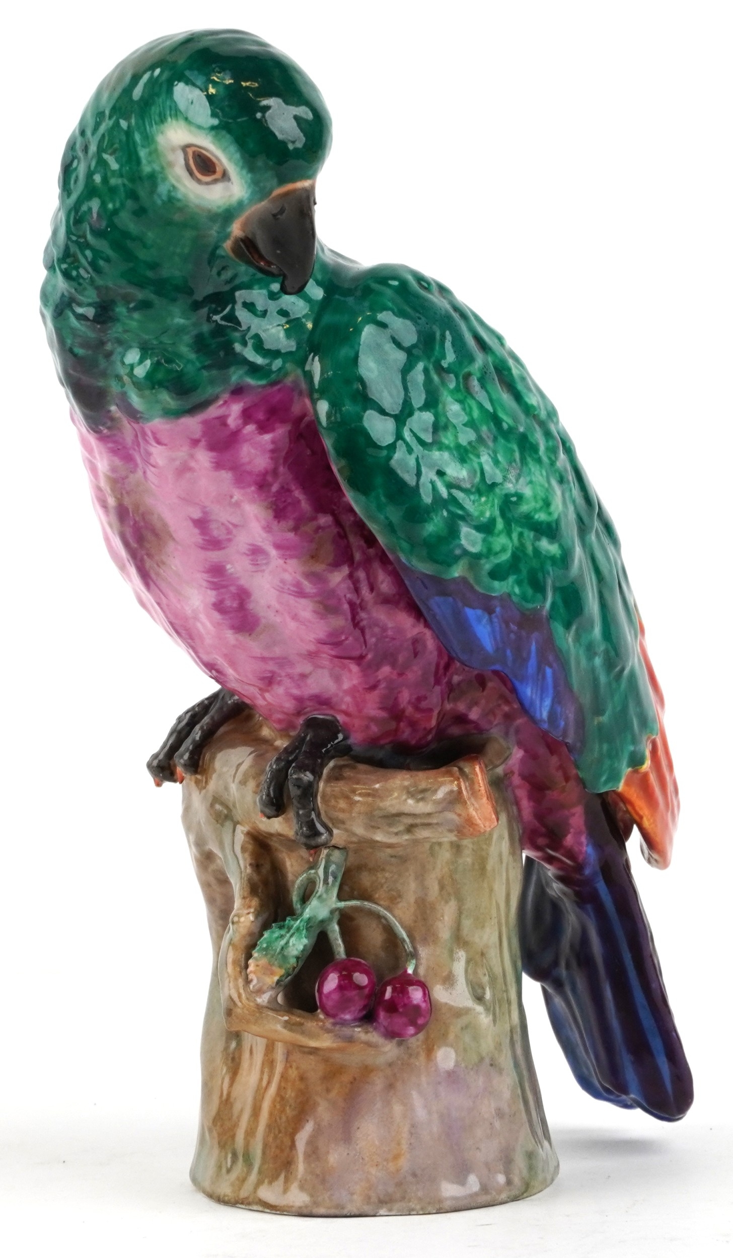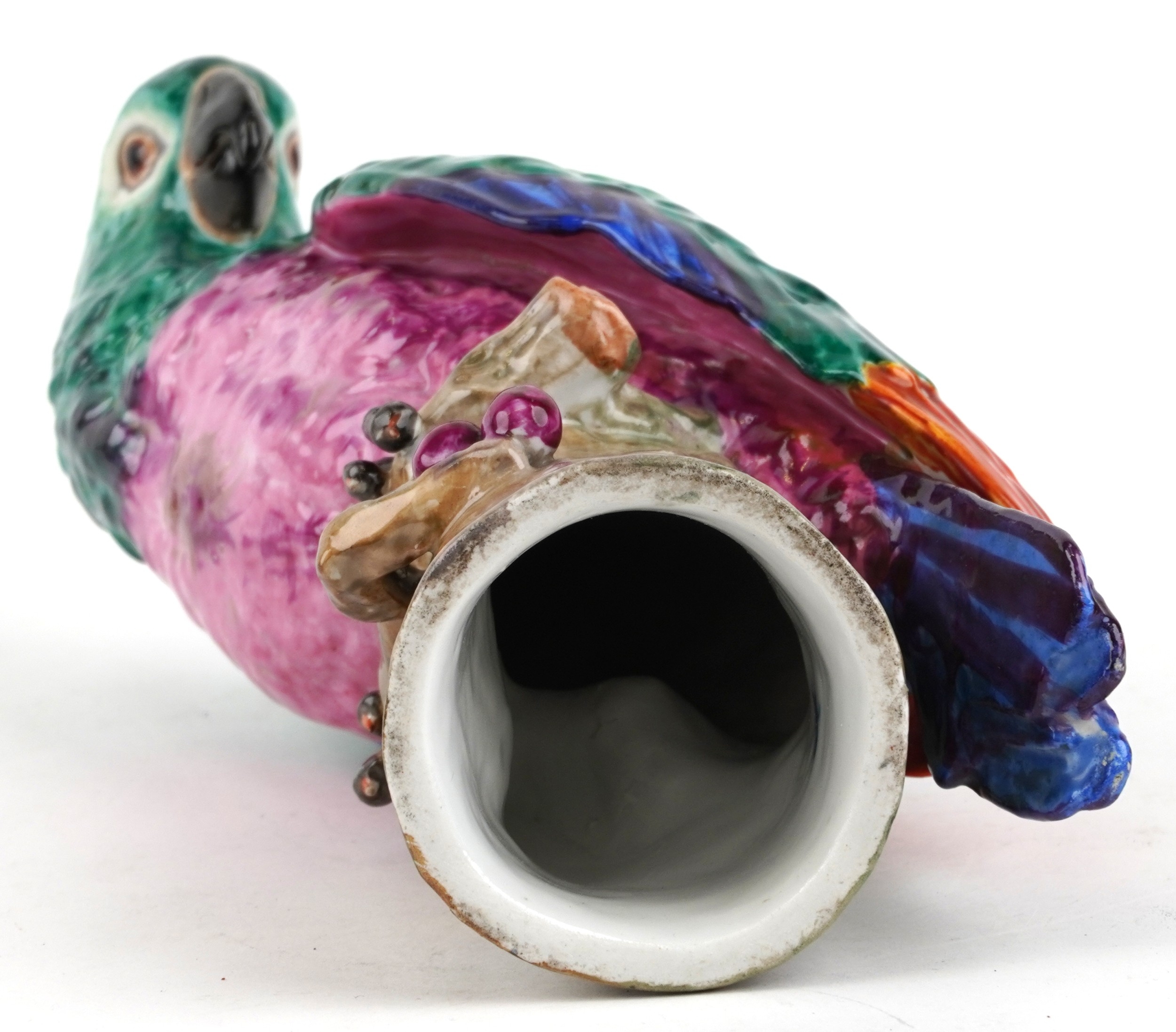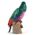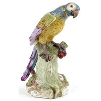 A Meissen style porcelain parrot perched on a branch, under ...