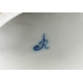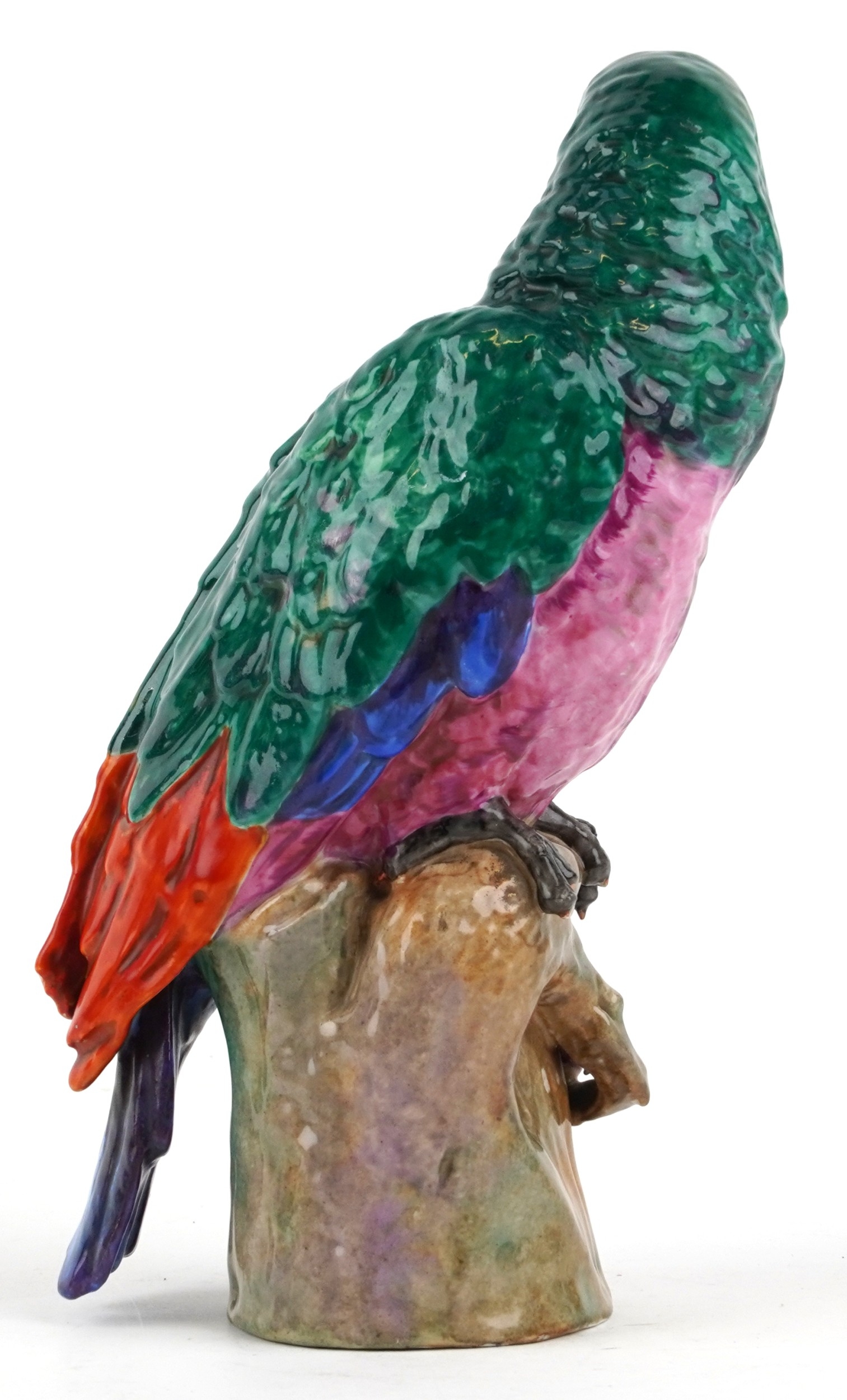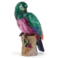 A Meissen style porcelain parrot perched on a branch, under glazed R mark to the base, 27cm high.