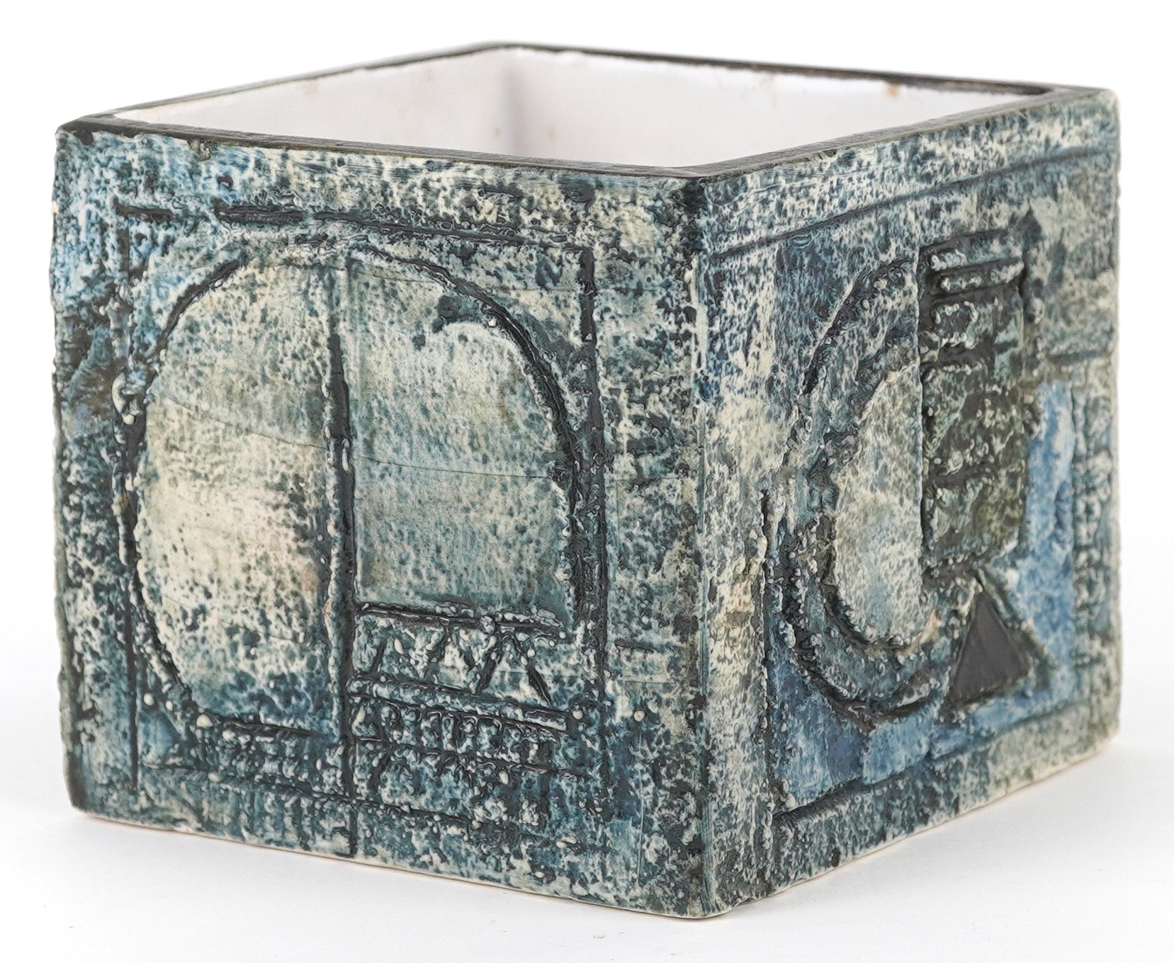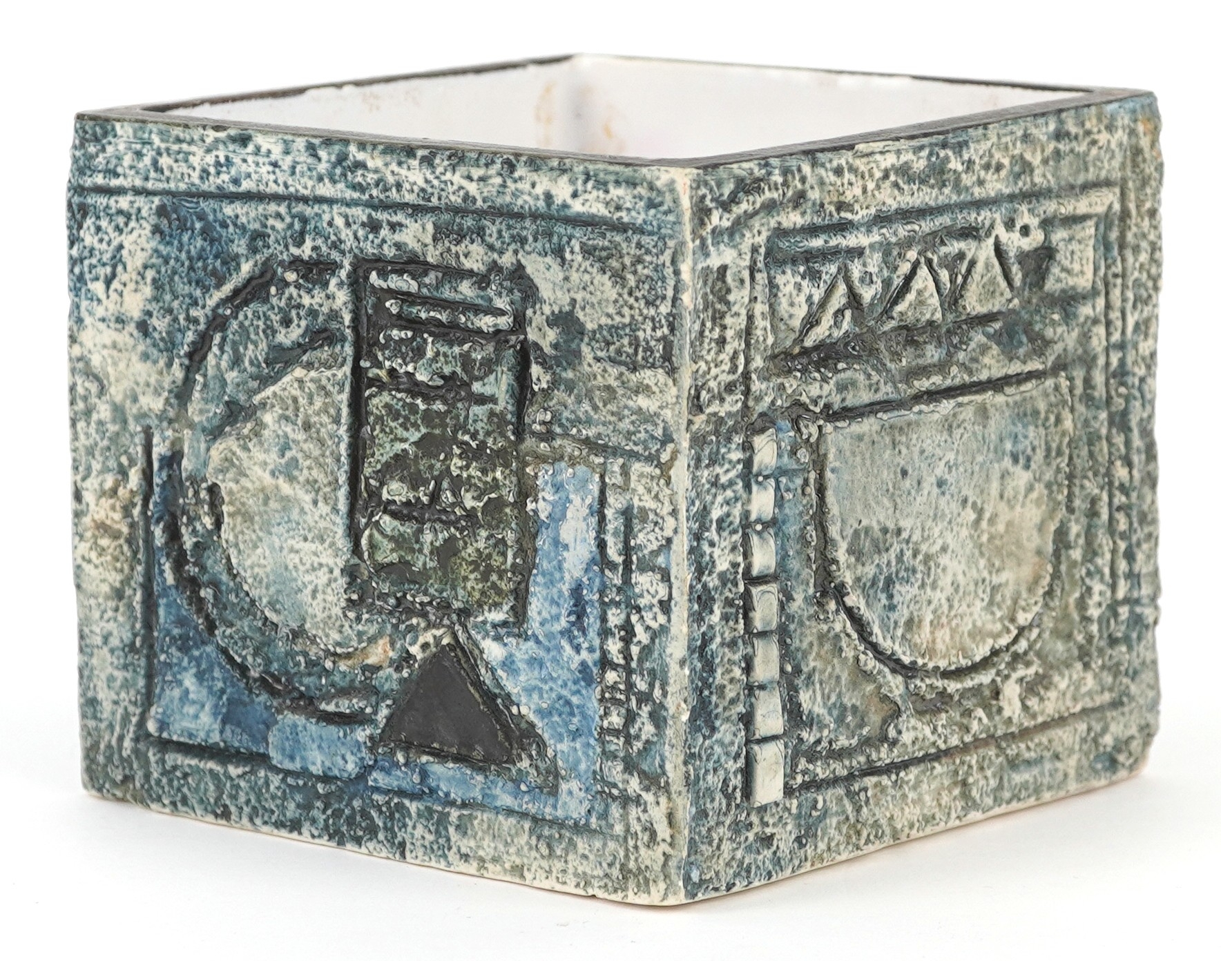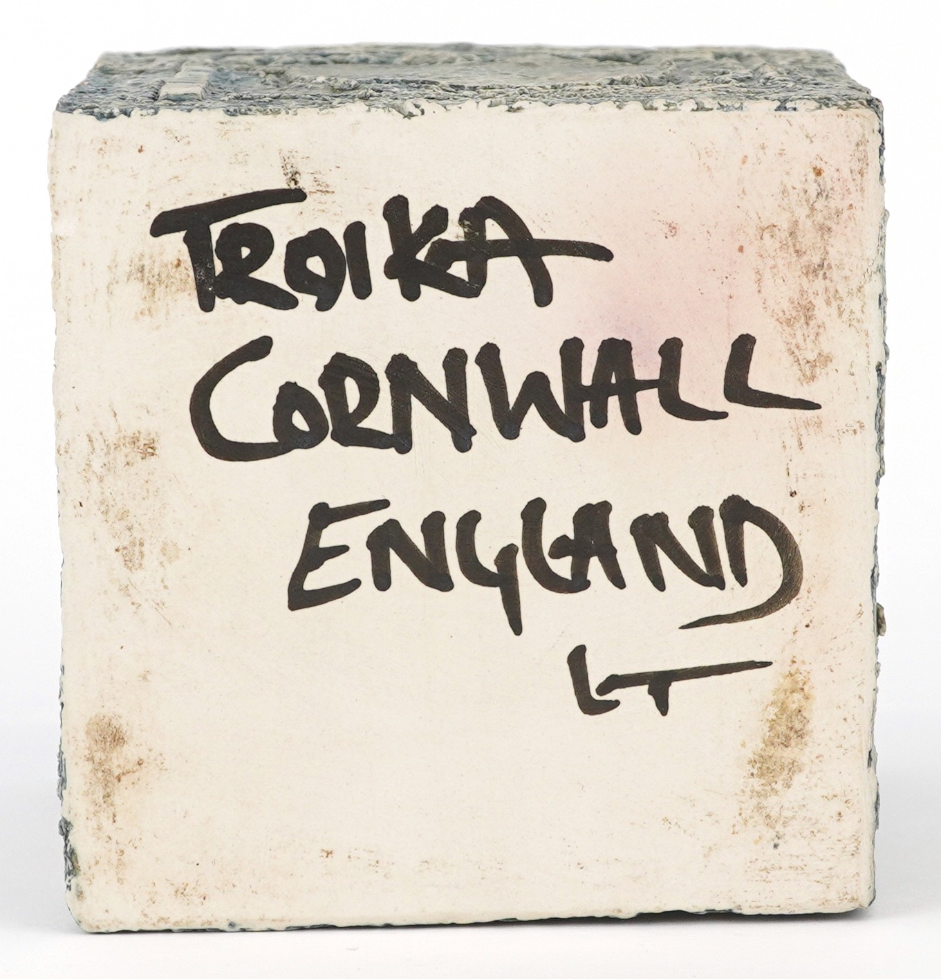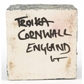 Troika, a studio pottery square vase with incised abstract design, signed to the base, 8.5cm high x 9cm wide.