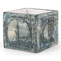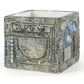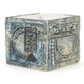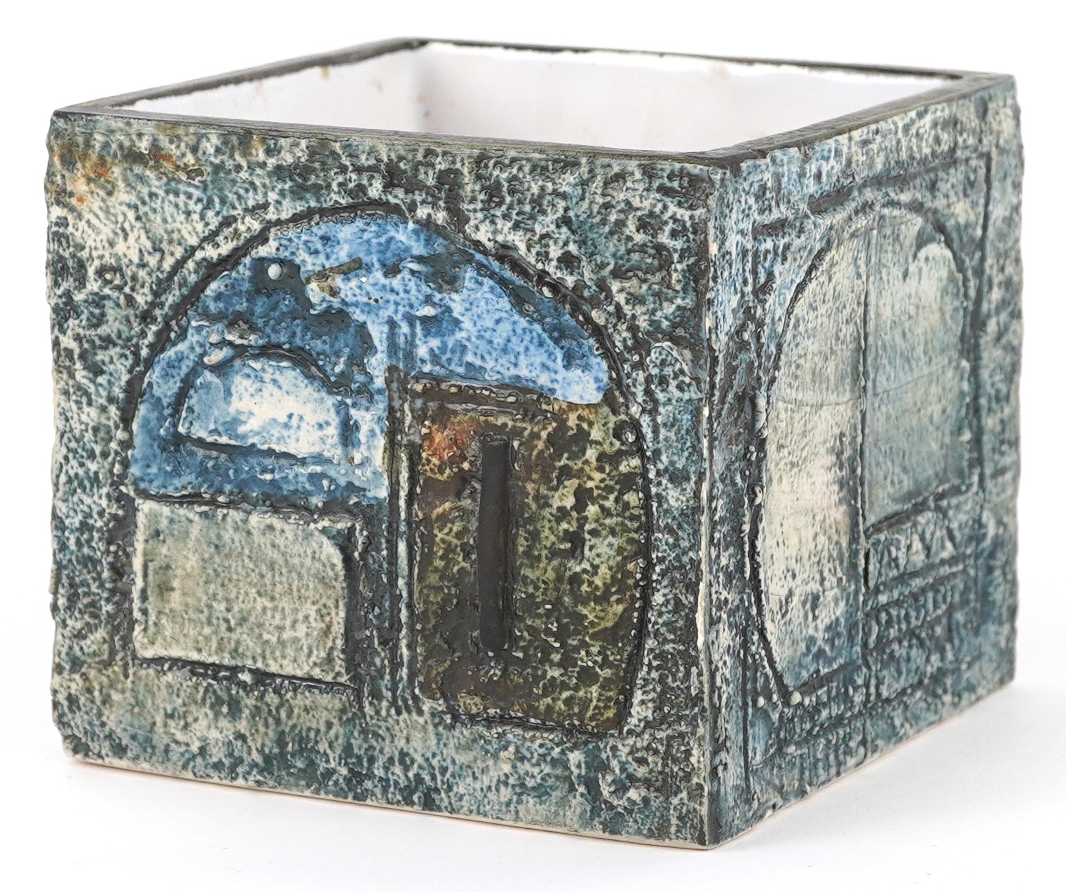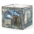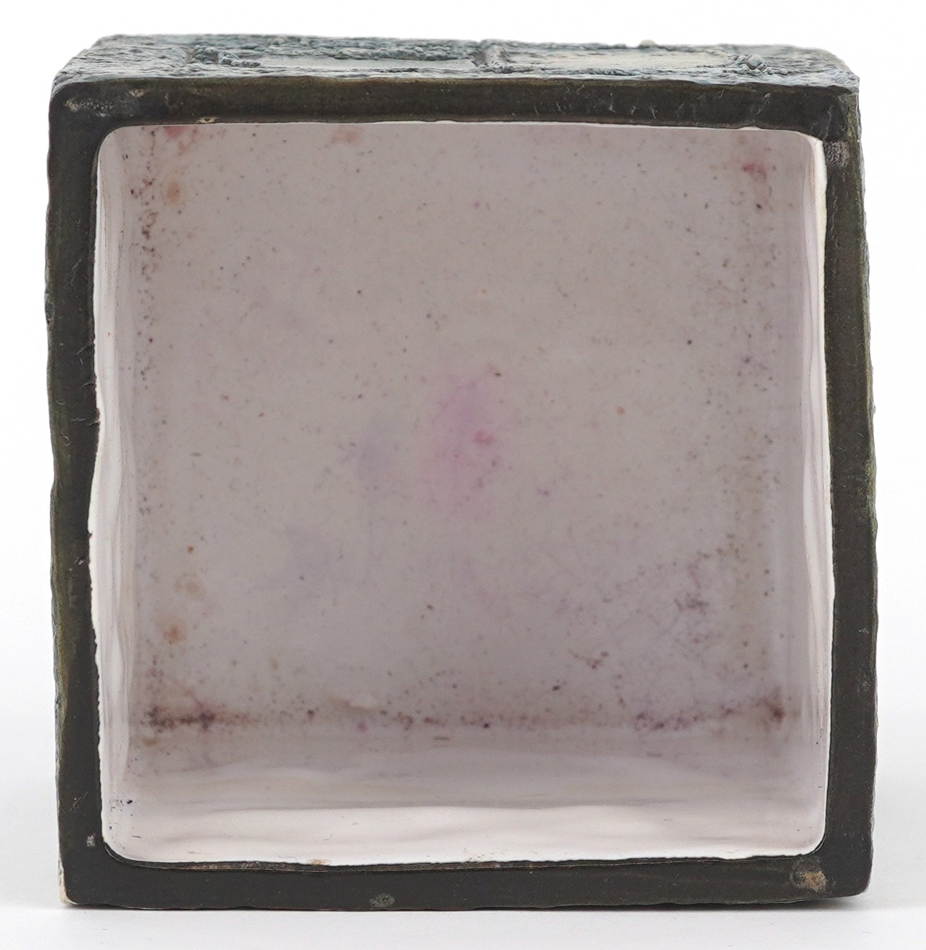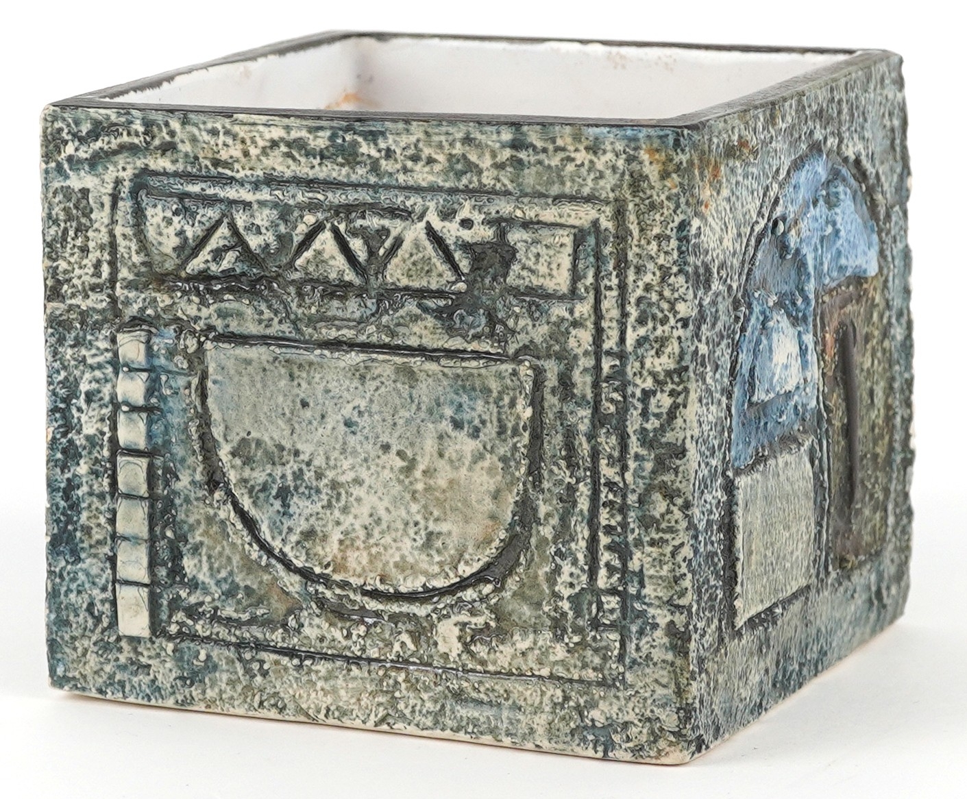 Troika, a studio pottery square vase with incised abstract design, signed to the base, 8.5cm high x 9cm wide.