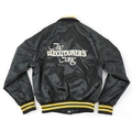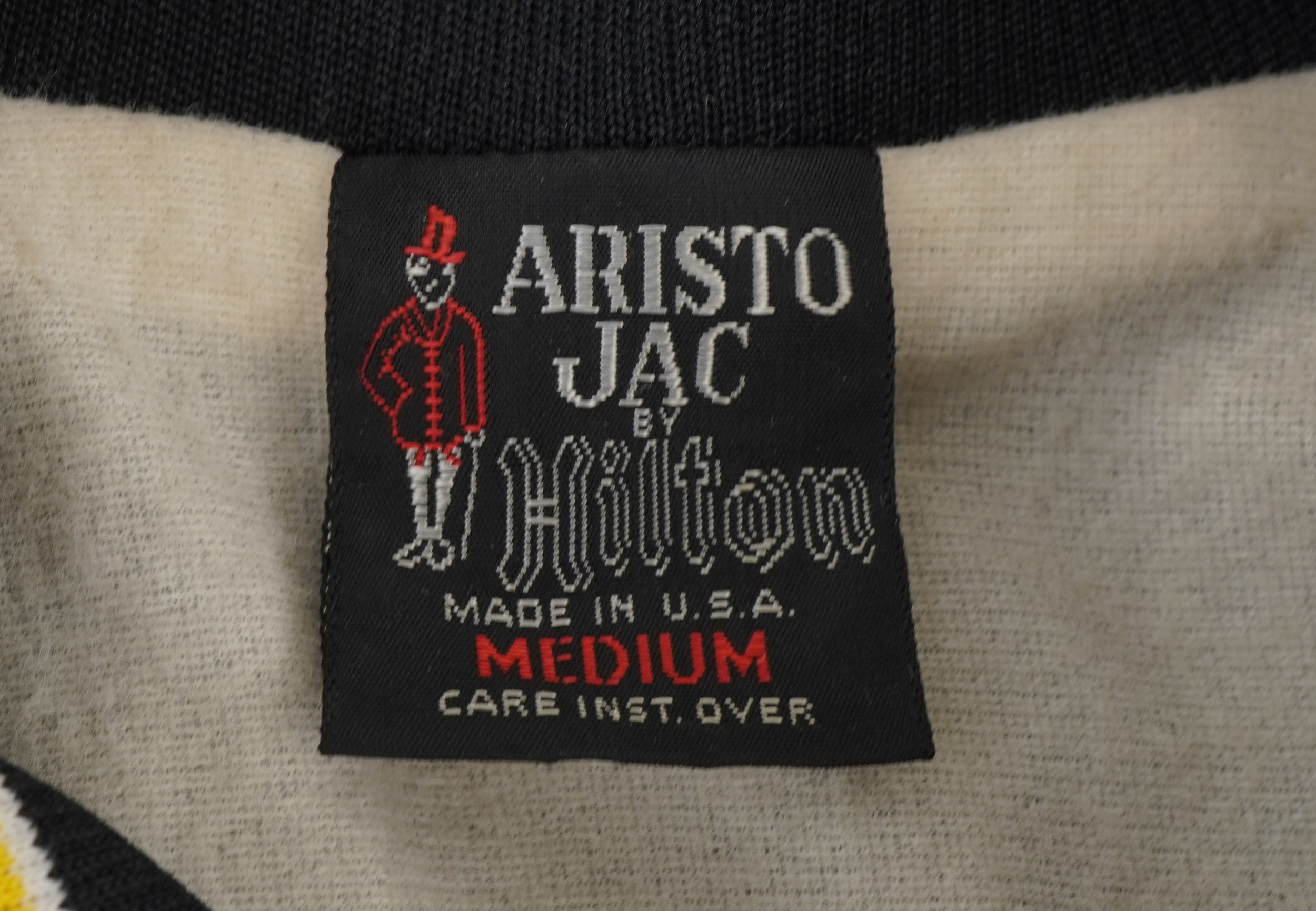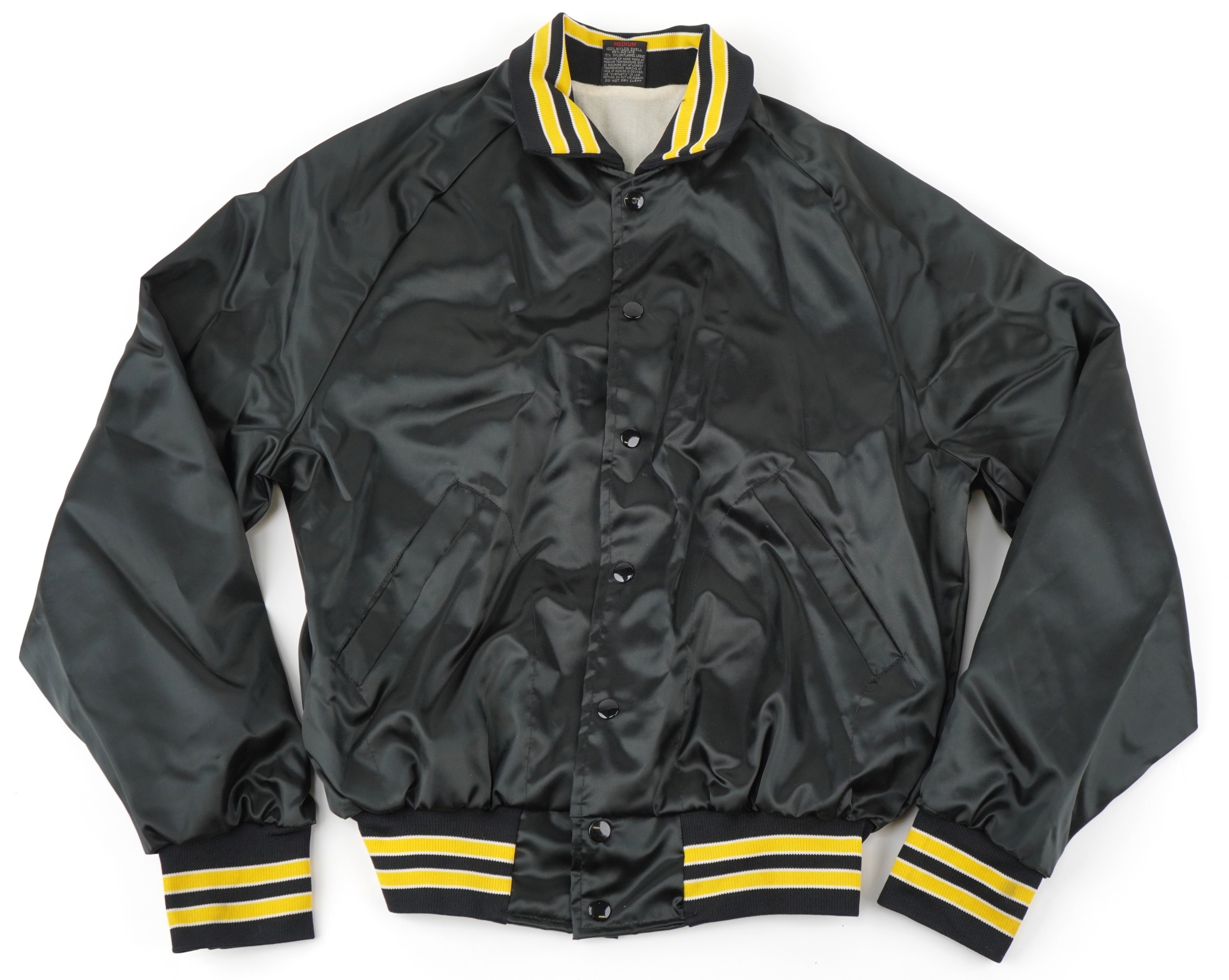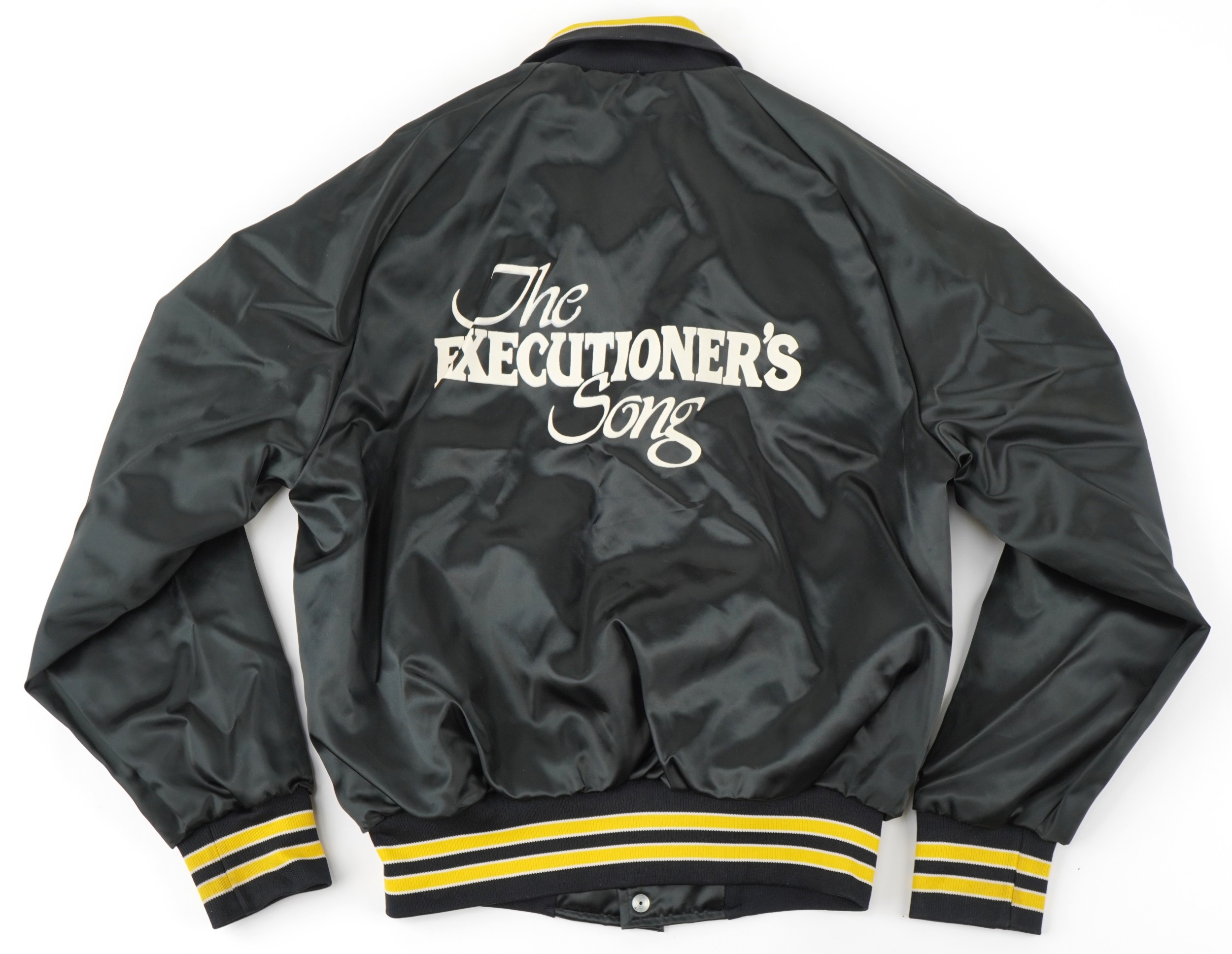 The Executioner's Song (1982), a black crew jacket with white printed back and yellow striped cuffs, medium, Hilton Aristo Jac label, Provenance: from the personal collection of Pamela Mann-Francis a Script & Continuity Department member for showcase films.