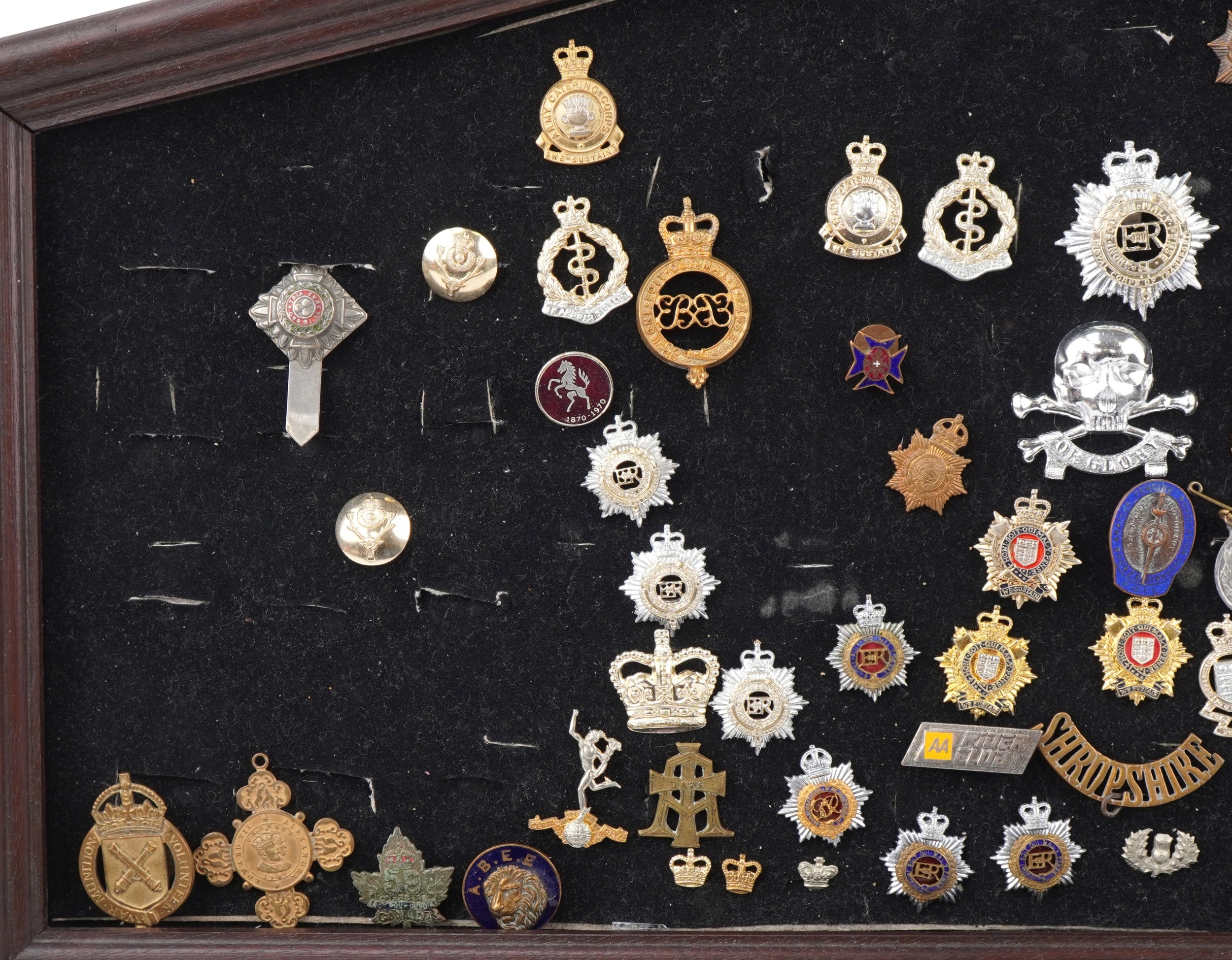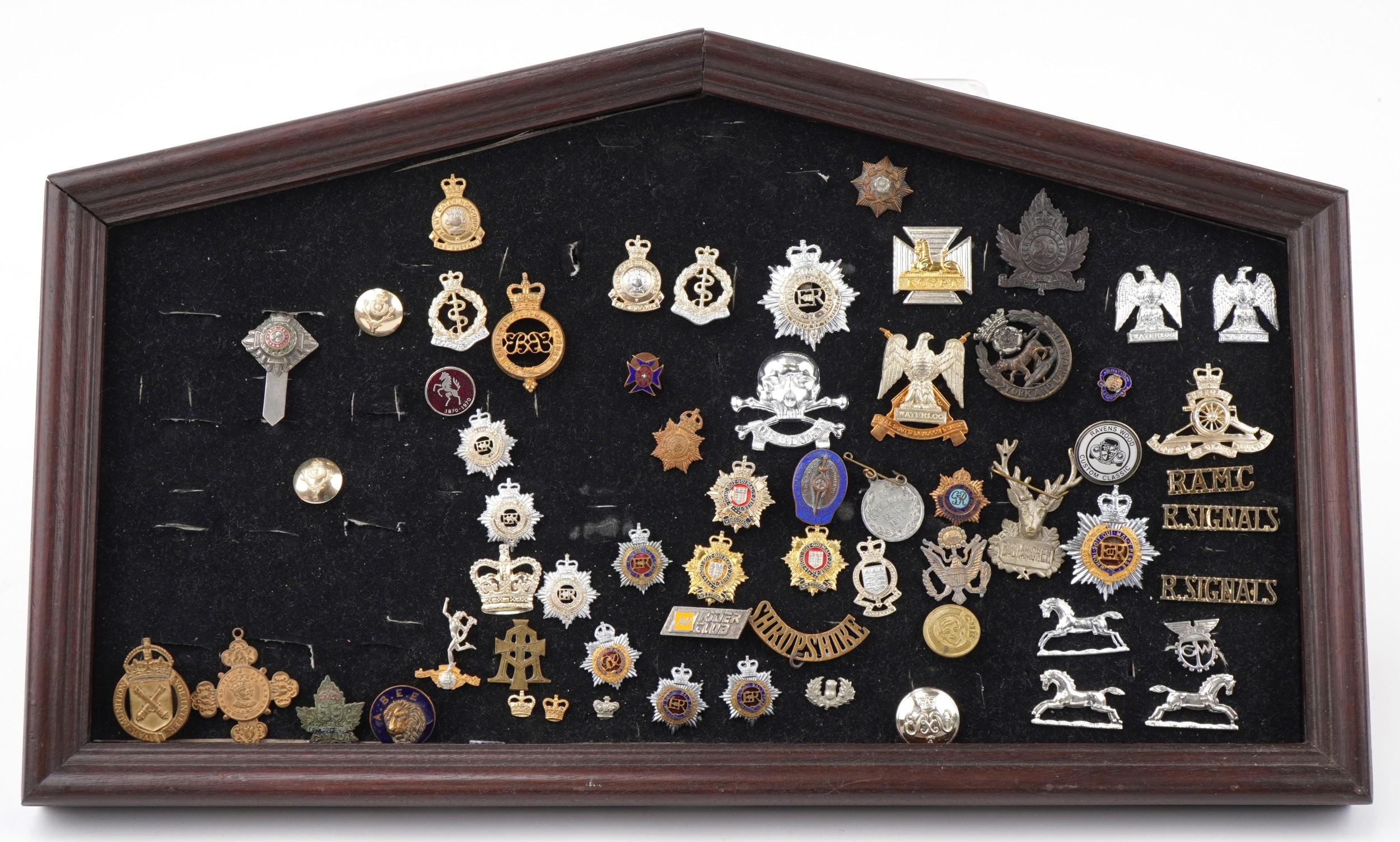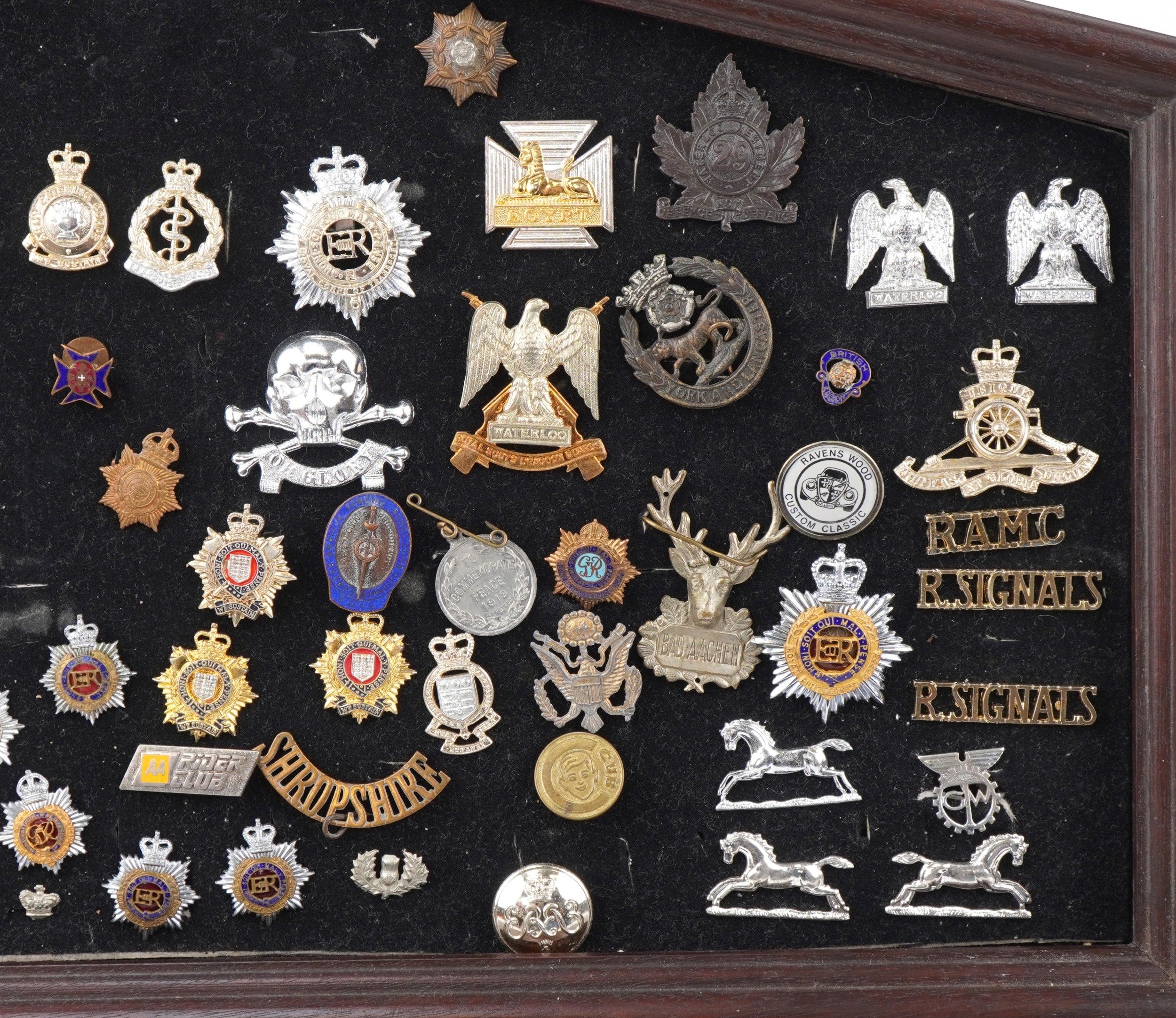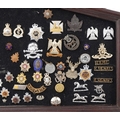 A collection of military interest cap badges, various regiments, including Egypt, Waterloo, Shropshire and Royal Army Service Corps, framed, 53cm wide.