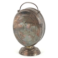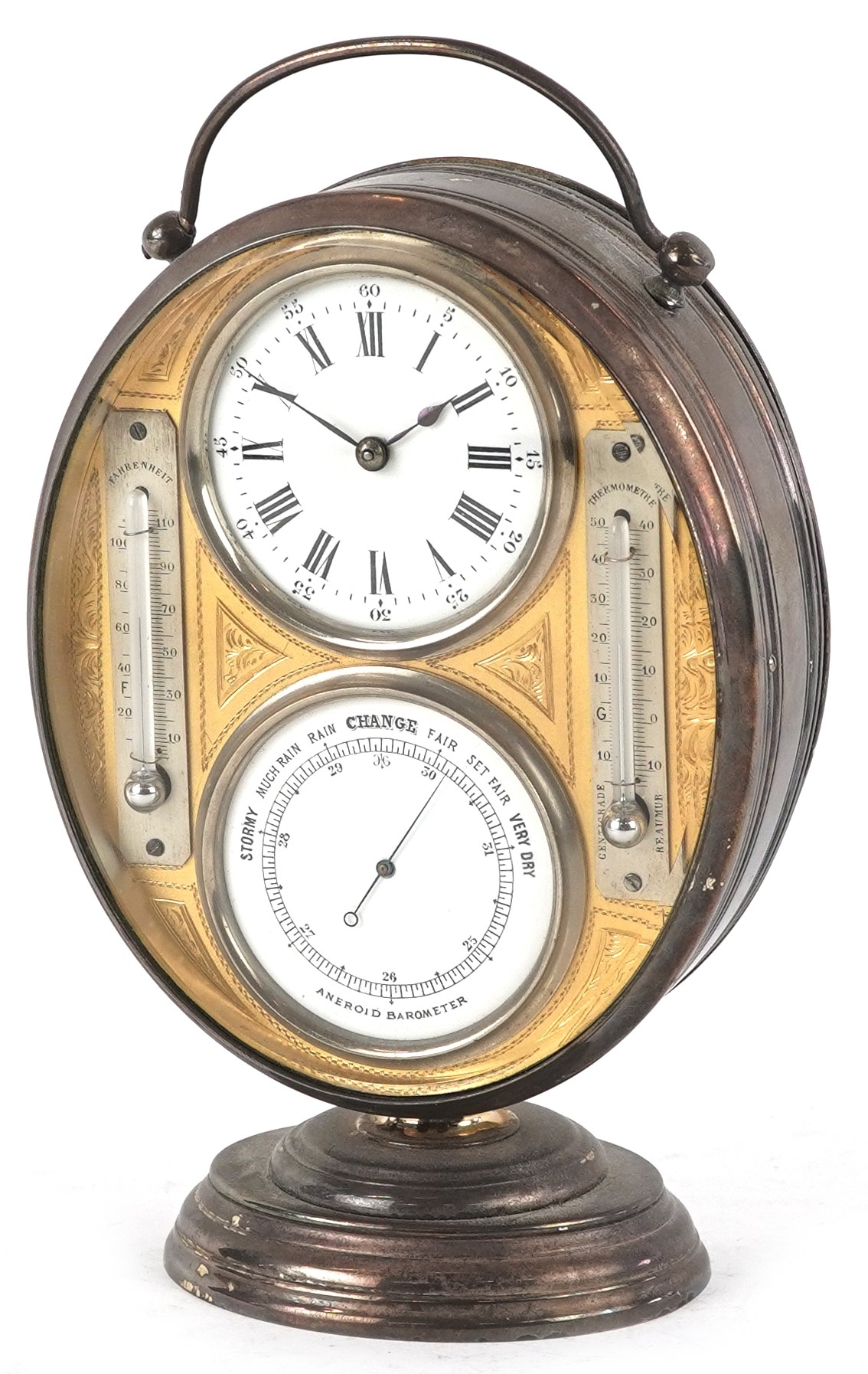 A French 19th century silver plated desk clock, barometer and thermometer compendium having enamelled dials, 18cm high.